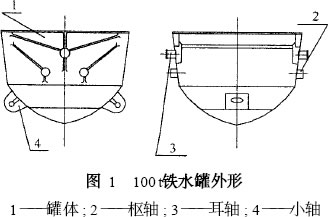 鐵水罐是冶金行業(yè)使用非常廣泛的一種設備,它的作用是裝運煉鐵廠生產出來的鐵水,并通過鐵水罐車將其運送到鑄鐵車間鑄鐵或煉鋼廠煉鋼。煉鐵廠100 t鐵水罐型號為ZT -100 - 1型,其結構的特點是罐臂(包括圖1所示2, 3部分)采用鑄造,罐身采用焊接,罐臂與罐身互焊。