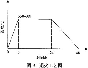 殘余應力會引起鋼件在使用一定時間以后,或在隨后的切削加工中產生變形或裂紋。耳軸退火主要用來消除堆焊造成的殘余應力、細化金相組織。采用局部退火裝置:制作一鋼筒,鋼筒內、外襯石棉,內盤電熱絲;鋼筒一端開口,套在耳軸上開口部與包體焊接固定;退火時鋼筒四周覆石棉,鋼包內耳軸位置覆石棉;對每只鐵水罐退火過程嚴格按照圖5所示溫度曲線要求。